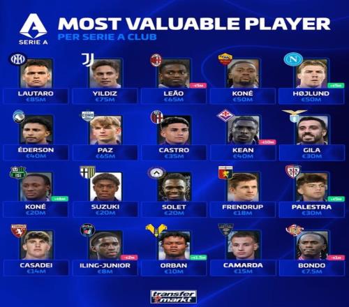 北京時間4月6日,德轉列出了意甲20家俱樂部各自身價最高的球員,勞塔羅8500萬歐元居首,凱南-伊爾迪茲、萊奧、霍...