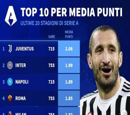 北京時間4月9日,德轉統計出了意甲近20年場均積分和總積分排名前10的球隊,尤文圖斯和國際米蘭分別在兩份榜單中...