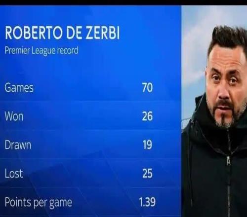 德澤爾比此前執教布萊頓在英超出戰70場勝率僅37%,場均1.39分