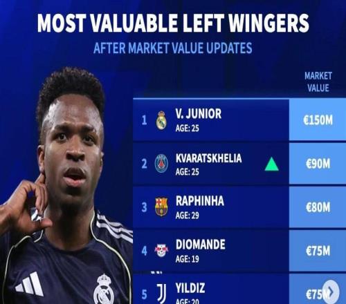 德轉左邊鋒身價前10:維尼修斯1.5億第一、KK、拉菲尼亞二三位