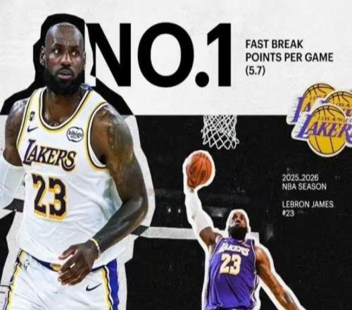 詹姆斯快攻得分聯盟第一,湖人官方發圖慶祝:詹姆斯又拿下第一名