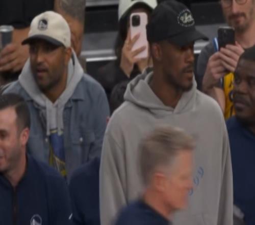你也來了!巴特勒頭戴鴨舌帽來到場邊為勇士加油助威