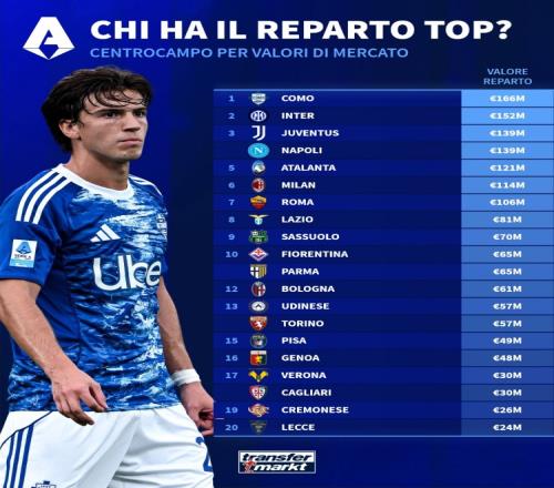德轉列意甲各隊中場總身價排行:科莫1.66億歐居首,國米第二