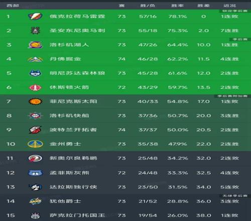 森林狼45勝28負暫列第5名,落后掘金0.5個勝場,火箭遭遇兩連敗,目前的戰績是43勝29負,落后森林狼1.5個勝場,落后掘金2個勝場。火箭現在已經暴露隱患,缺少了穩定拿球的后衛,關鍵時刻太依賴阿杜。快船119-94大勝猛龍迎來三連勝,以37勝36負穩居第8名,落后第7的太陽3個勝場。開拓者130-99狂勝雄鹿,繼續落后快船0.5個勝場暫列第9名。勇士克服傷病的影響,109-106險勝弱旅籃網,迎來兩連勝穩居第10名。