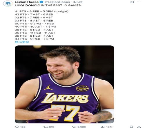 東契奇今天又炸了。25投15中,三分10中5,41分8籃板3助攻3搶斷。湖人116-99輕取籃網,最近12場贏了11場。他連續12場30+,隊史第四,跟貝勒、韋斯特、科比坐一桌。