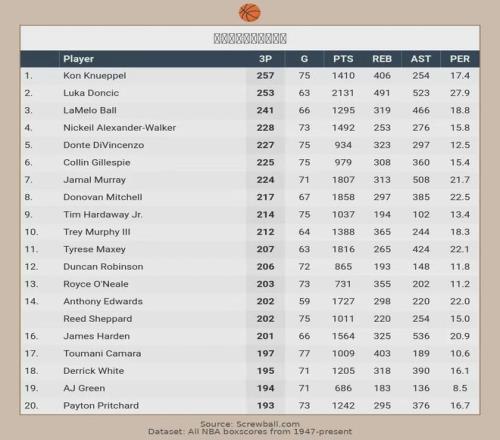 個人數據和帶隊成績雙雙爆發,讓克尼佩爾在新秀榜始終占據第一位置,力壓“美國之子”25屆狀元秀弗拉格,后者本賽季至今出戰64場比賽,場均上陣33.8分鐘得到20.3分6.6板4.5助1.2斷,三項命中率46.7%、27.8%和81.2%,獨行俠以24勝52負已徹底無緣附加賽。