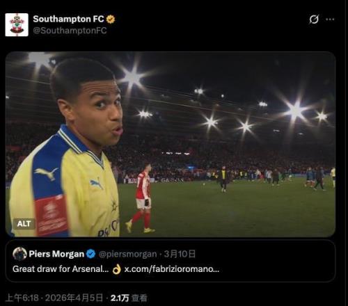 抽簽后摩根曾說阿森納抽到好簽,被南安普頓官方“挖墳” 懂球帝 2026-04-05 08:56:31 在足總杯1/4決賽2-1淘汰阿森納后,南安普頓官方社媒挖出了知名槍迷皮爾斯-摩根在抽簽結果出爐后說阿森納抽到好簽的帖子,并予以回擊。在足總杯1/4決賽抽簽結果出爐時,英國知名主持人、阿森納球迷皮爾斯-摩根轉發了抽簽結果,并寫道:“阿森納的抽簽結果非常好”在2-1淘汰阿森納后,南安普頓官方社媒轉發了摩根的帖子,并配上了打入絕殺進球的謝伊-查爾斯的表情包。阿森納免費觀看_足總杯免費觀看_查爾斯免費觀看_阿森納高清在線_足總杯高清在線_查爾斯高清在線 阿森納 足總杯 查爾斯 南安普頓 保羅·皮爾斯 亞歷克斯·摩根 上一篇: 曼城20領先利物浦!哈蘭德頭球破門梅開二度,塞梅尼奧助攻 下一篇: 英超各支球隊最貴球員:哈蘭德領銜,薩卡、帕爾默、維爾茨在列