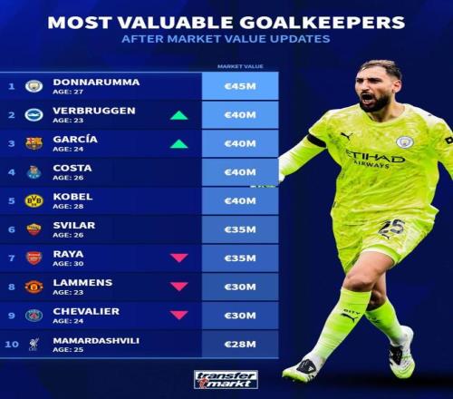 北京時間4月5日,在更新了歐洲五大聯賽球員的身價之后,德轉列出了目前世界足壇身價排名前十的門將,多納魯馬雖然未能幫助意大利晉級世界杯,但他仍以4500萬歐元的身價位列世界足壇門將的第一位。
