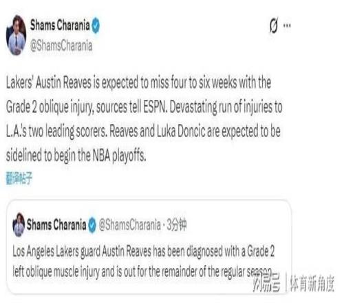 北京時間4月5日,一則令湖人球迷揪心不已的壞消息再度傳來!據NBA資深記者Shams的權威報道,湖人隊又一位后場悍將里夫斯遭遇了左側腹斜肌二級拉傷的重創,經專業醫療團隊評估,預計他將缺席未來4到6周的賽事。這一傷病不僅意味著里夫斯將無緣本賽季剩余的常規賽,而且極有可能讓他錯過季后賽首輪的激烈角逐。
