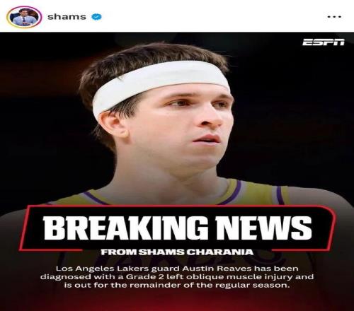 名記Shams報道,里夫斯被診斷為左側腹斜肌二級拉傷,將缺席本賽季剩余常規賽比賽。