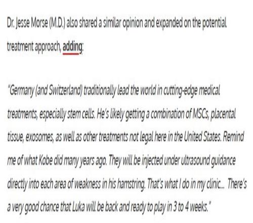 名醫(yī)杰西-莫斯也持有相似觀點,并進一步解讀了可能采用的治療方案:“德國(以及瑞士)在尖端醫(yī)療領(lǐng)域,尤其是干細胞治療方面,一直處于世界領(lǐng)先水平。他很可能會接受間充質(zhì)干細胞、胎盤組織、外泌體等聯(lián)合治療,其中一些療法在美國尚未獲批。這讓我想起多年前科比做過的治療。這些藥劑會在超聲引導(dǎo)下,直接注射到腿筋每一處受損薄弱的位置——這也是我在診所里采用的方案……東契奇非常有希望在3到4周內(nèi)康復(fù)并復(fù)出。”