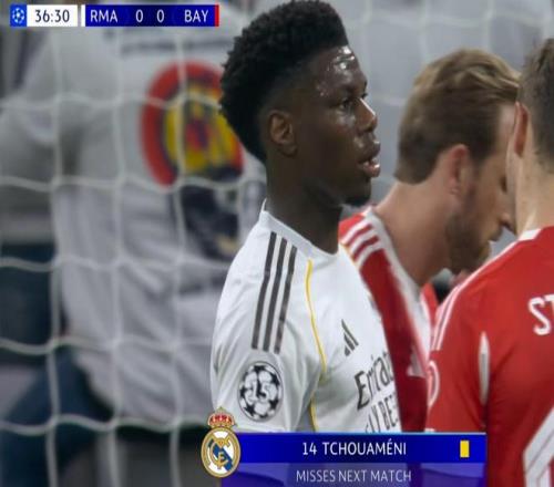 放倒奧利塞染黃,楚阿梅尼累積3黃缺席歐冠八強戰次回合 懂球帝 2026-04-08 09:02:19 北京時間4月8日凌晨,皇家馬德里在歐冠八強戰中主場對陣拜仁慕尼黑。上半場第37分鐘,楚阿梅尼因為放倒奧利塞染黃。在面對奧利塞的高速前插時,楚阿梅尼放倒了對手,這也讓這位法國后腰吃到黃牌。這是楚阿梅尼本賽季在歐冠賽場中吃到的第3張黃牌,依照歐冠規則,楚阿梅尼將因為累積3張黃牌而缺席次回合的比賽。目前,皇家馬德里暫時0-1落后于拜仁。楚阿梅尼染黃GIF歐冠免費觀看_拜仁免費觀看_對陣免費觀看_歐冠高清在線_拜仁高清在線_對陣高清在線 歐冠 拜仁 對陣 奧利塞 楚阿梅尼 皇家馬德里 世俱杯半決賽 上一篇: 迪亞斯本賽季歐冠參與8球,為哥倫比亞球員單賽季最多 下一篇: 坎塞洛:亞馬爾才18歲,不能要求他有30歲球員那樣成熟的心智