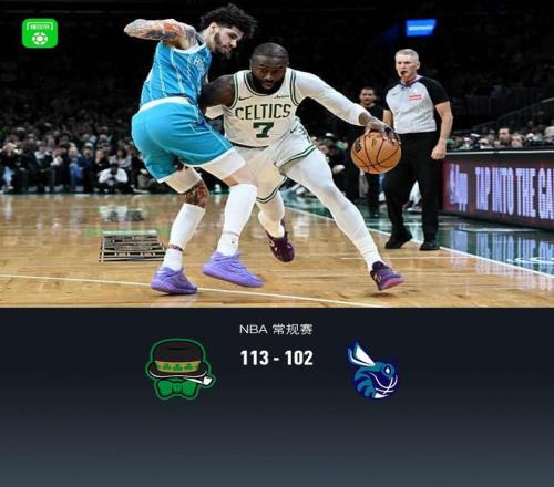 第四節凱爾特人杰倫-布朗拿下8分,黃蜂克努佩爾拿下5分,最終凱爾特人113-102戰勝黃蜂