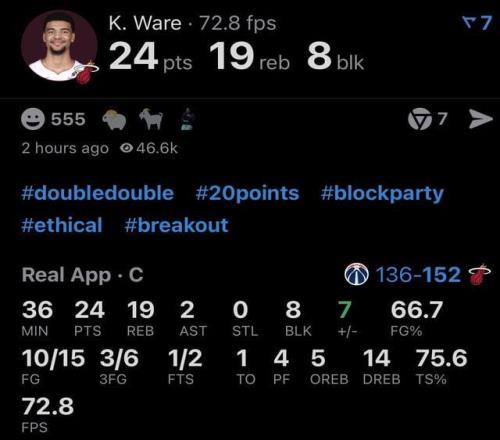 熱火新秀Kel'el Ware昨天打奇才,24分19籃板8蓋帽,準三雙帶蓋帽的數據。賽后熱區Reddit吵翻了——有人翻記錄發現,官方統計和現場播報對蓋帽數各執一詞,7個還是8個成了羅生門。