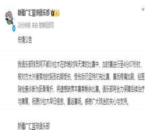 新疆男籃上場比賽106-101加時險勝天津男籃,換帥之后首次獲得勝利,原本以為新疆男籃能夠借助這場勝利再次向季后賽發起沖擊,但是新疆男籃依舊沒有逃脫傷病的厄運。新疆男籃官方宣布,阿不都沙拉木在昨晚對陣天津的比賽中,加時賽進行至4分07秒時,被對方大外援落地時踩到右腳受傷,賽后經醫院檢查診斷為跖骨骨折,將遺憾缺席本賽季剩余比賽。在阿不都沙拉木賽季報銷之前,新疆男籃已經連續傷了朱旭航、吳冠希、西爾扎提三名大將,此番阿不都沙拉木再次受傷之后,新疆男籃已經徹底失去了季后賽的希望,很難與北控、廣州等隊競爭季后賽席位。
