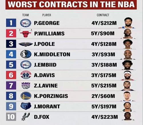 高薪合同最坑人的地方,從來不是球員偶爾拉胯一兩場,而是球隊把整支球隊的未來都壓了上去,結果幾年復幾年,產出、健康和戰績這三樣東西,就沒見它們同時在線過。喬治的4年2.12億、恩比德的3年1.93億、威廉姆斯的5年9000萬,再加上莫蘭特的5年1.972億,這幾筆巨款擺在一起,爭議點其實一目了然:錢是按頂級核心給的,但表現卻沒能一直穩在核心檔位。看看數據吧,喬治在76人至今場均16.5分、5.4籃板、4.0助攻;恩比德場均27.6分、10.8籃板、3.7助攻;威廉姆斯在公牛這么多年,場均也就9分、4個籃板左右;莫蘭特生涯場均22.4分、7.4助攻、4.6籃板。