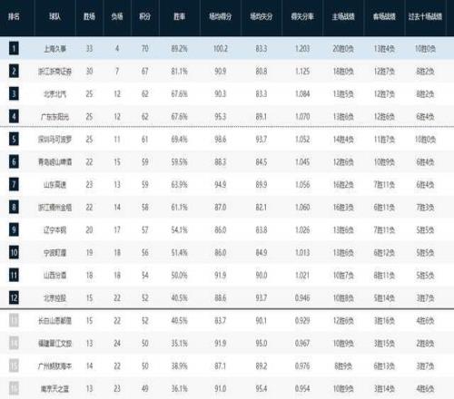 CBA常規賽已經打到第37輪,率先進行的五場比賽中,上海男籃119-116險勝福建男籃,青島男籃98-96雙加時力克遼寧男籃,廣東男籃117-84大勝吉林男籃,北京首鋼84-65輕取北控男籃,浙江廣廈93-85逆轉寧波男籃。經過這幾場精彩廝殺之后,CBA積分榜又發生了全新的變化,上海男籃18連勝繼續穩居第一,廣東重返第四的位置,北京首鋼殺到第三,遼寧男籃輸球暫列第九名,北控男籃第十二名岌岌可危。