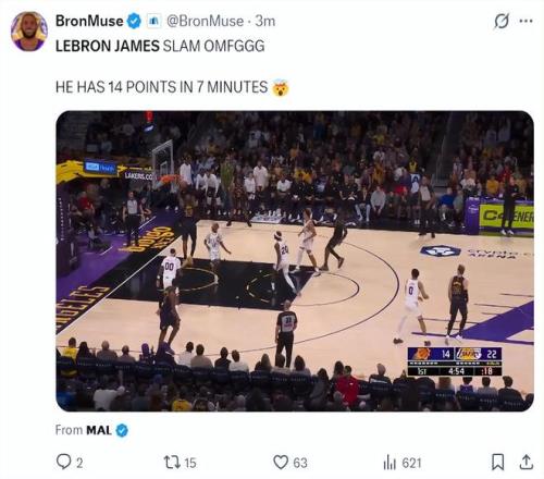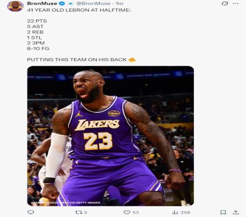 第二節開場太陽打出12-2直接完成反超,雷迪克暫停后還是41歲的勒布朗將球隊扛了起來,他單節6中4拿到8分1籃板,各種的突破與翻身跳投,上半場打完詹姆斯10中8+三分2中2拿到22分5助攻2籃板1搶斷,命中率80%,他幫助湖人再度建立9分的優勢。湖媒:把這支球隊放心交給他。