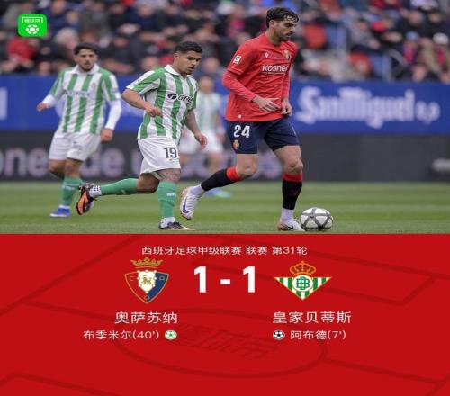 奧薩蘇納11貝蒂斯,阿布德、布季米爾破門,安東尼染黃+累計五黃下輪停賽 懂球帝 2026-04-13 08:40:37 北京時間4月12日,西班牙足球甲級聯賽第31輪,奧薩蘇納主場對陣皇家貝蒂斯。比賽中,阿布德遠射閃擊,布季米爾點射扳平比分,安東尼染黃+累計五黃下輪停賽。最終,奧薩蘇納1-1貝蒂斯。關鍵事件第7分鐘,阿布德反擊遠射破門,貝蒂斯反客為主1-0!第40分鐘,巴倫廷-戈麥斯送點,布季米爾操刀命中,1-1!精彩瞬間雙方球員步入球場,比賽即將打響第23分鐘,阿布德遠射攻門,皮球被撲出第40分鐘,安東尼抗議判罰染黃,累計黃牌下輪停賽第55分鐘,維克托-穆尼奧斯一腳兜射,巴列斯精彩撲救球隊陣容技術統計貝蒂斯免費觀看_穆尼奧斯免費觀看_布季米爾免費觀看_貝蒂斯高清在線_穆尼奧斯高清在線_布季米爾高清在線 貝蒂斯 穆尼奧斯 布季米爾 奧薩蘇納隊 馬克·安東尼 易卜拉欣·阿布德 上一篇: 延續低迷,貝蒂斯在佩萊格里尼執教下首次連續7輪聯賽不勝 下一篇: 世體:亞馬爾將出席巴薩vs馬競次回合賽前發布會