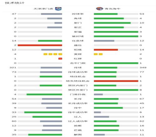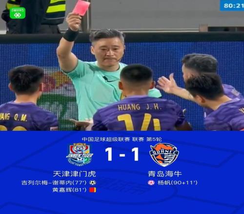 北京時(shí)間4月12日19:00,中超第5輪,天津津門虎主場對陣青島海牛。上半場,埃朱馬擊中立柱;下半場,金洋洋失誤謝蒂內(nèi)破門得分,黃嘉輝染紅,補(bǔ)時(shí)讀秒階段楊帆自擺烏龍?jiān)崴秃镁帧W罱K比分天津津門虎1-1青島海牛。