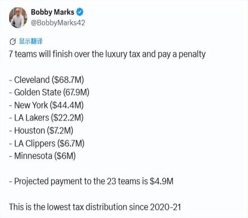 2024-25賽季,共有10支球隊繳稅,總罰金4.612億美元,20支非繳稅球隊每隊分到約1150萬美元。據馬克斯統計,本賽季預計的490萬美元分紅,是2020-21賽季以來的最低值。