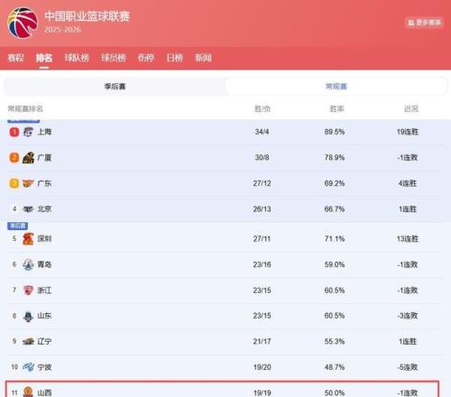 據CBA官方最新積分榜(截至4月14日)顯示,山西隊當前戰績為19勝19負,位列第11位,恰好懸于季后賽附加賽資格線之上;身后吉林、北控僅落后1個勝場,勝負關系稍有閃失,即刻出局。