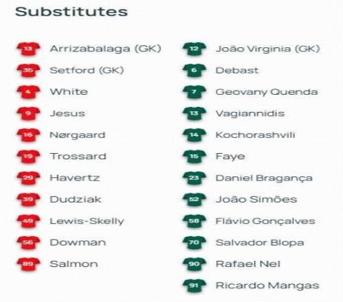 替補:13-凱帕、35-湯米-塞特福德、4-本-懷特、9-熱蘇斯、16-內爾高、29-哈弗茨、39-哈里森-杜齊亞克、49-劉易斯-斯凱利、56-道曼、89-馬利-薩蒙