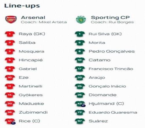 阿森納首發:1-戴維-拉亞、2-薩利巴、3-克里斯蒂安-莫斯克拉、5-因卡皮耶、6-加布里埃爾、10-埃澤、11-馬丁內利、14-哲凱賴什、20-馬杜埃凱、36-馬丁-蘇比門迪、41-賴斯