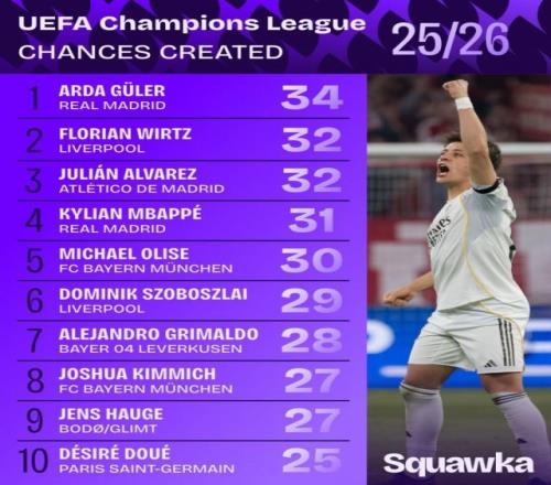 Squawka統計了本賽季歐冠球員創造機會的次數,并列出榜單,居萊爾34次居首。