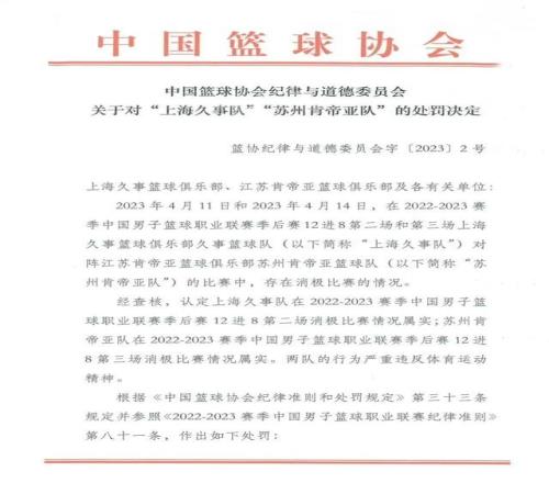 據(jù)央視新聞,2023年4月17日,中國籃協(xié)發(fā)布關于上海久事男籃對陣蘇州肯帝亞男籃比賽的處罰決定:
