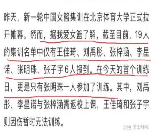 而更為尷尬的是,即便只有6人前往國家隊(duì)報道??蛇@6名球員,能夠參加第一天集訓(xùn)的卻只有可憐的1人。由于傷病困擾,張子宇和王佳琦暫時無法參加訓(xùn)練。而劉禹彤、李星諾以及張梓涵,他們?nèi)藙t因?yàn)閷W(xué)業(yè)問題,不得不暫時返校。這樣一來,國家隊(duì)集訓(xùn)第一天,也就只剩下張明珠一人。從集訓(xùn)19人大名單,到只有6人前往報道,再到最后只有1人參加集訓(xùn),這看上去似乎有點(diǎn)凄涼。
