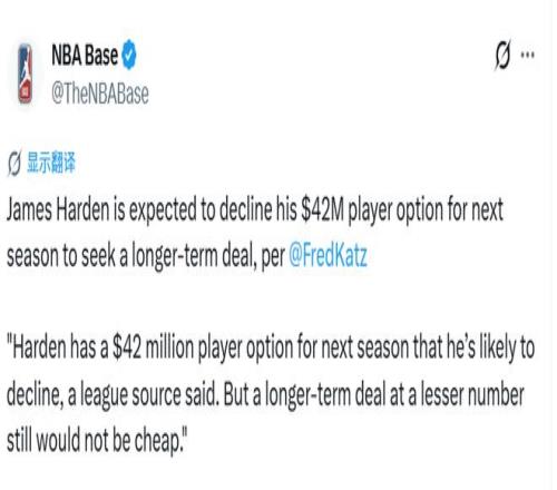 北京時間4月17日,據The Athletic(TA)報道,聯盟消息人士透露:哈登下賽季擁有4200萬美元球員選項,他大概率會選擇跳出。即便后續簽下一份年薪更低的長期合同,薪資總價依舊不菲。