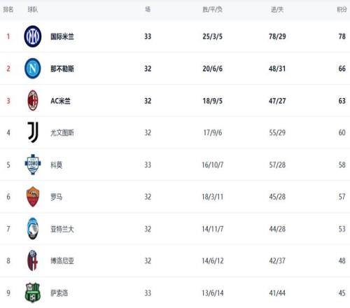 在積分榜上,國(guó)際米蘭25勝3平5負(fù),拿到78分,高居榜首位置。那不勒斯以66分排名第2。國(guó)際米蘭足足領(lǐng)先那不勒斯12分。這樣的差距讓冠軍歸屬幾乎失去懸念。AC米蘭就落后國(guó)際米蘭更多了,只拿到63分,排名第3。第4名的是尤文圖斯,拿到60分。輸球的科莫依然是58分,排名第5。羅馬以57分排名第6,比科莫少賽一場(chǎng)。亞特蘭大拿到53分,排名第7。拉齊奧只有44分,排名第10。