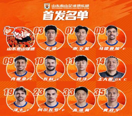山東泰山首發:14-王大雷、3-彭嘯、11-劉洋、23-佩德羅·阿爾瓦羅、33-高準翼、35-黃政宇、7-謝文能、8-馬德魯加、9-克雷桑·巴塞洛斯、10-卡扎伊什維利、19-澤卡