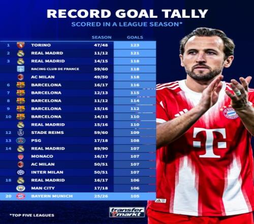 目前這項紀錄是1947/48賽季的都靈,他們在40場比賽里打進123球。榜單前20里其他球隊都是踢了38場,而拜仁只有34輪,這就更牛了。