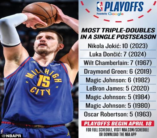 約基奇單個季后賽曾轟下10次三雙NBA歷史第一&東契奇7次并列第二 Twitter 2026-04-18 18:20:19 TOP具體如下:約基奇:10次(2023年)東契奇:7次(2024年)張伯倫:7次(1967年)追夢:6次(2019年)魔術師:6次(1982年)詹姆斯:5次(2020年)魔術師:5次(1984年)魔術師:5次(1980年)奧斯卡·羅伯特森:5次(1963年) 籃球免費觀看_NBA免費觀看_掘金免費觀看_籃球高清在線_NBA高清在線_掘金高清在線 籃球 NBA 掘金 約基奇 湖人 東契奇 勇士 追夢 詹姆斯 上一篇: 季后賽首輪G1尼克斯迎戰(zhàn)老鷹阿努諾比不在傷病名單可以打 下一篇: 雷迪克:當海斯和艾頓保持最佳狀態(tài)時我們就是最強的!