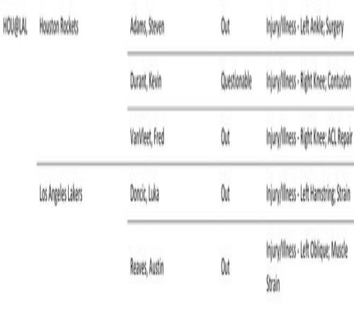 北京時間4月18日,NBA官方公布了火箭vs湖人首戰的傷情報告,火箭一方,范弗利特(右膝前交叉韌帶手術康復)、亞當斯(左腳踝手術康復)缺陣,杜蘭特(右膝挫傷)被列為出戰成疑。湖人一方,東契奇(左腿筋拉傷)、里夫斯(左側腹斜肌拉傷)缺陣。雙方的首場比賽,將在4月19日上午8點30分進行。