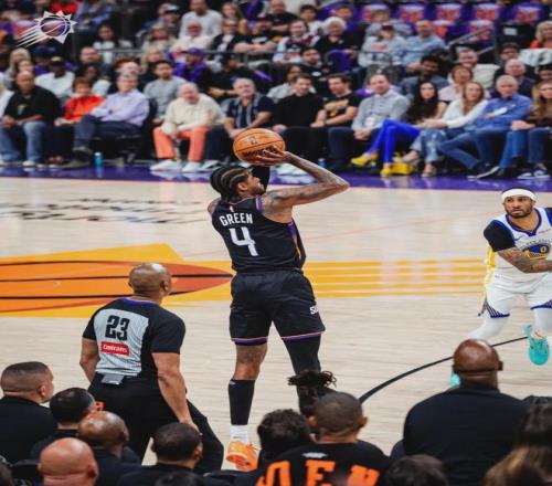 布克和場邊的追夢對噴垃圾話,主裁判福斯特將兩人驅逐。太陽111-96淘汰勇士,挺進季后賽,本賽季附加賽全部結束。杰倫-格林36分6板4助2斷3帽、布克20分6板8助、古德溫19分9板6斷。兩場附加賽,杰倫-格林一共轟下71分!