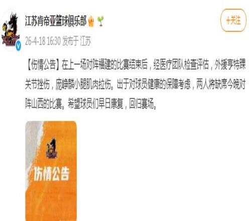 北京時間4月18日,江蘇男籃官宣最新的傷病報告,球隊后場雙核龐崢麟與亨特均是遭遇傷病侵襲,他們均將缺席本日與山西男籃的比賽。