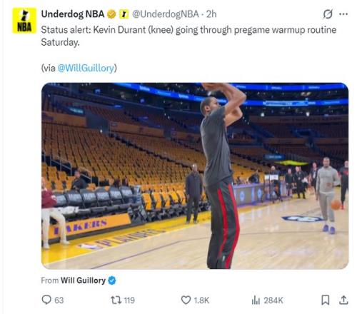 杜蘭特因?yàn)橛蚁ナ軅麩o法出戰(zhàn)G1,杜蘭特常規(guī)賽鏖戰(zhàn)78場沒想到在隊(duì)內(nèi)訓(xùn)練中受傷。烏度卡透露杜蘭特是髕骨上方跟隊(duì)友相撞后遭遇戳傷,除了有疼痛感外還影響了他的移動,但X光與MRI沒有結(jié)構(gòu)性傷。