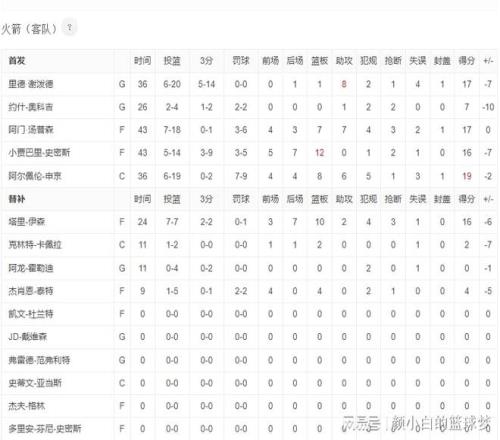 全場比賽,申京19中6拿19分8籃板6助攻3失誤,阿門16中6拿17分7籃板7助攻,小賈14中5拿16分12籃板,謝潑德20中6+三分14中5拿17分8助攻4失誤,奧科吉4中2拿到7分。
