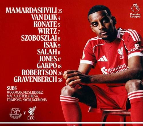 利物浦客戰埃弗頓:薩拉赫、維爾茨先發,伊薩克出戰 懂球帝 2026-04-19 21:16:25 北京時間4月19日21:00,英超第33輪,利物浦客場對陣埃弗頓,本場比賽主裁判是克里斯-卡瓦納,VAR是保羅-霍華德,賽前雙方公布首發:利物浦首發:25-馬馬爾達什維利、26-羅伯遜、4-范戴克、5-科納特、8-索博斯洛伊、17-瓊斯、38-赫拉芬貝赫、7-維爾茨、11-薩拉赫、9-伊薩克、18-加克波埃弗頓首發:1-皮克福德、15-奧布賴恩、6-塔爾科夫斯基、32-布蘭斯韋特、16-米科連科、37-加納、27-蓋伊、22-霍爾、7-麥克尼爾、9-貝托、10-恩迪亞耶貝托免費觀看_埃弗頓免費觀看_薩拉赫免費觀看_貝托高清在線_埃弗頓高清在線_薩拉赫高清在線 貝托 埃弗頓 薩拉赫 伊薩克 維爾茨 利物浦 上一篇: TA:塞門約本來傾向于加盟阿森納瓜式球員的定義出現了變化 下一篇: 費迪南德:卡里克必須轉正,不然你告訴我還有誰合適