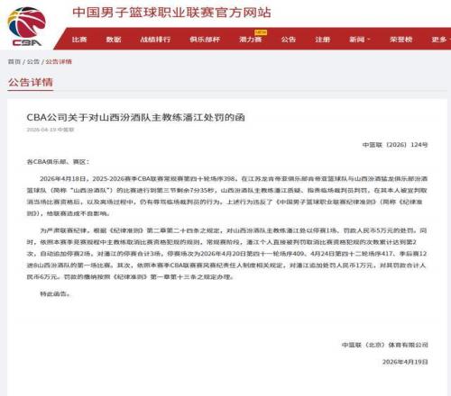 北京時(shí)間4月19日消息,CBA常規(guī)賽收官階段,山西汾酒隊(duì)卻接連遭遇打擊。4月19日,CBA公司公布處罰決定,球隊(duì)主教練潘江因在與江蘇肯帝亞隊(duì)比賽中指責(zé)、辱罵裁判員,被處以停賽3場(chǎng)、罰款6萬元的處罰。這意味著他將缺席常規(guī)賽最后兩場(chǎng)對(duì)陣廣東宏遠(yuǎn)和南京同曦的比賽,以及季后賽12進(jìn)8的首場(chǎng)對(duì)決。雪上加霜的是,這已經(jīng)是山西隊(duì)本賽季收到的第四張罰單,罰單數(shù)量領(lǐng)跑全聯(lián)盟,賽場(chǎng)紀(jì)律問題儼然成為球隊(duì)前進(jìn)路上的絆腳石。