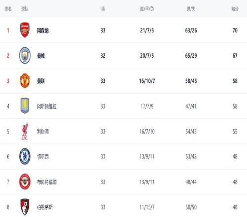在積分榜上,阿森納雖然輸球,依然占據(jù)榜首位置,總積分是70分。曼城越追越近,總積分達(dá)到67分,只比阿森納少3分。而且,曼城還少賽一場(chǎng)。沒想到爭(zhēng)冠格局會(huì)變得如此激烈。阿森納此前積累的優(yōu)勢(shì)被不斷消耗。曼聯(lián)以58分排名第3。阿斯頓維拉贏球之后,也是58分,排名第4。利物浦以55分排名第5。切爾西48分排名第6。至于熱刺,只拿到31分,排名倒數(shù)第3,深陷降級(jí)區(qū)。