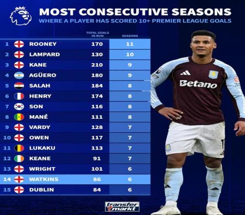 北京時間4月20日,德轉統計出了英超歷史連續最多賽季進球數上雙的15名球員,魯尼、蘭帕德、哈里-凱恩位列前三,上周末達成本賽季英超進球10+的沃特金斯上榜。