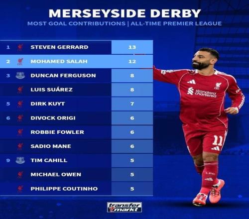 數據統計顯示,薩拉赫在默西賽德郡德比歷史射手榜位列次席。