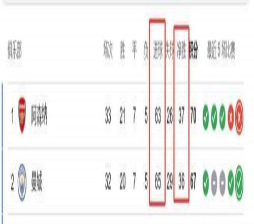 目前阿森納凈勝球37球、總進球63球;曼城凈勝球36球、總進球65球。兩隊兩項數據都極其接近。