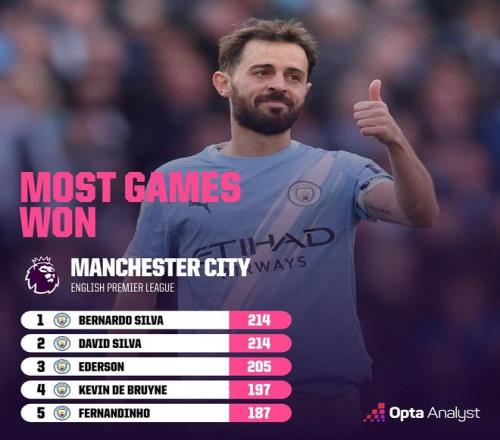 B席代表曼城英超取勝214場,追平大衛(wèi)席爾瓦并列隊史第一 懂球帝 2026-04-21 09:15:13 北京時間4月20日,曼城在英超第33輪的天王山之戰(zhàn)中主場2-1擊敗了聯(lián)賽領(lǐng)頭羊阿森納,在少賽一場的情況下將兩隊的積分差距縮小到3分,而此戰(zhàn)對于曼城隊長伯納多-席爾瓦而言也是其職業(yè)生涯的里程碑一戰(zhàn)。根據(jù)Opta的統(tǒng)計,本場比賽是現(xiàn)年31歲的伯納多-席爾瓦加盟曼城至今代表球隊在英超贏下的第214場比賽,他也就此追平了大衛(wèi)-席爾瓦,并列成為曼城隊史英超取勝場次最多的球員。曼城隊史英超取勝場次前5:1. 伯納多-席爾瓦 214場1. 大衛(wèi)-席爾瓦 214場3. 埃德森 205場4. 德布勞內(nèi) 197場5. 費爾南迪尼奧 187場英超免費觀看_曼城免費觀看_阿森納免費觀看_英超高清在線_曼城高清在線_阿森納高清在線 英超 曼城 阿森納 埃德森 大衛(wèi)-席爾瓦 費爾南迪尼奧 凱文·德布勞內(nèi) 上一篇: 哈蘭德絕殺后的心理戰(zhàn):曼城如何逆轉(zhuǎn)9分差距 下一篇: 曼城新核崛起:天才邊衛(wèi)還是體系紅利