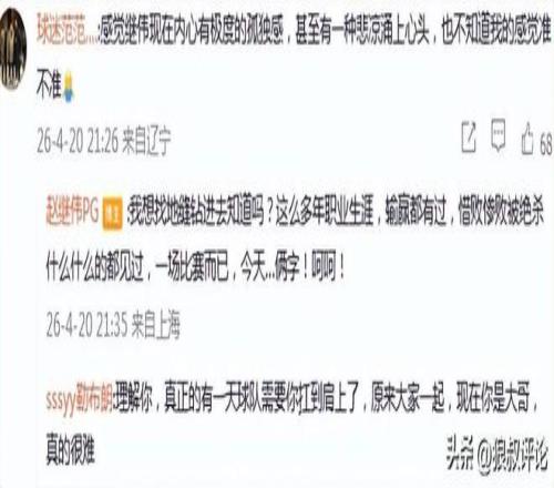 隨后,趙繼偉在社媒補充回應:“我想找地縫鉆進去知道嗎?這么多年職業生涯,輸贏都有過,惜敗慘敗被絕殺什么什么的都見過,一場比賽而已,今天…倆字!呵呵!”。