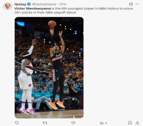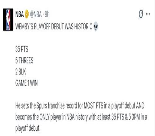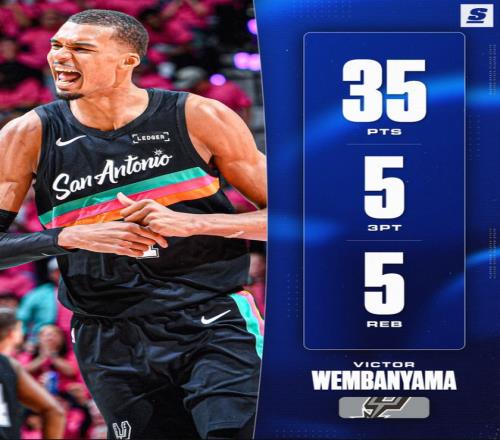 1.文班亞馬首秀35分超越鄧肯的32分,成為馬刺季后賽首秀得分王;